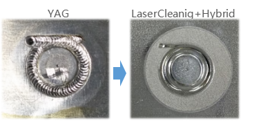 电池注液完成后需要马上激光焊接密封,但是注液残留在焊接区域,会造成焊接不良的问题。同样使用相同的纳秒激光器,预先对注液口周围进行激光清洗,然后马上进行复合激光焊接,能够得到鳞状的焊缝和平整光滑的外观。另外,铝的导热率很高,如果熔融铝内部有微小气孔的话,气体溢出后会很快凝固,不会形成这样的类似镜面外观。