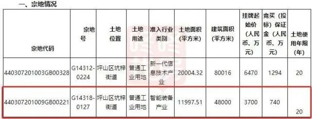 G14318-0127宗地,位于坪山区坑梓街道,准入行业为智能装备产业,建面4.8万平,挂牌起始价3700万元,土地使用年限为20年。须自《出让合同》签订之日起1年内开工,3年内竣工。