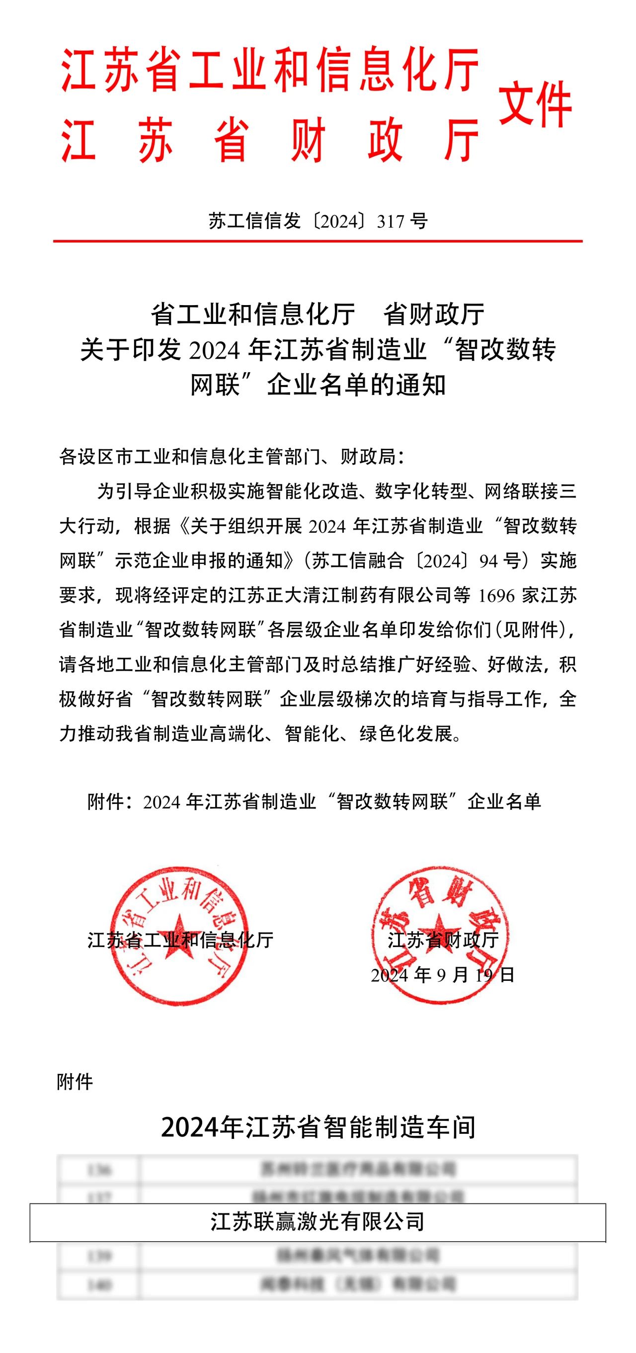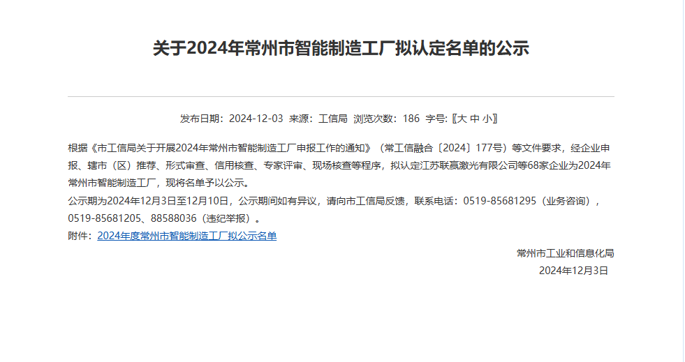 Recently, the Jiangsu Provincial Department of Industry and Information Technology officially released the list of intelligent manufacturing workshops for 2024. Jiangsu United Winners Laser Co., Ltd. (UW Jiangsu), leveraging its outstanding achievements in intelligent transformation and digitalization, has been successfully selected as a "Jiangsu Province Intelligent Manufacturing Workshop". This is the second time that UW Jiangsu has received this prestigious honor since it was first awarded the "Jiangsu Province Intelligent Manufacturing Workshop" in 2023! In addition, with its exceptional strength in intelligent manufacturing, UW Jiangsu has also been successfully recognized as a "Changzhou City Intelligent Manufacturing Factory".