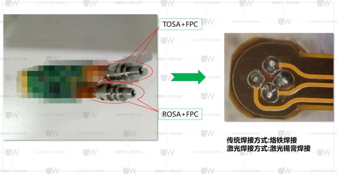 一个光模块,通常由光发射器件(TOSA,含激光器)、光接收器件(ROSA,含光探测器)、功能电路和光(电)接口等部分组成。由于光模块本身集成度高,且大量使用FPC软板,因此激光焊接相较于传统的烙铁焊接、热风焊接、HotBar焊接、电子压焊、波峰焊接等更适用于光通讯模块的制造。