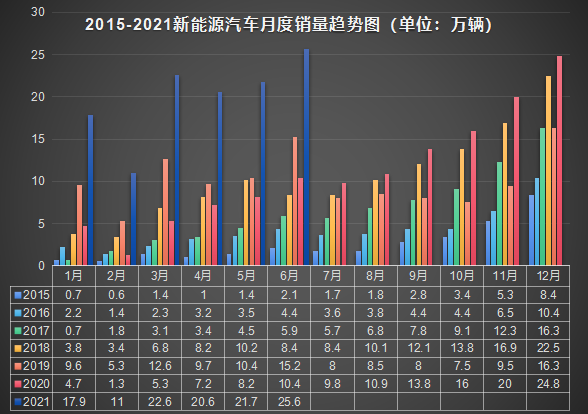2015年,我国成为新能源汽车销售第一大国,至今6年时间,我国新能源汽车销量始终保持稳步上升趋势。随之国内新能源汽车生产与锂电池行业迅猛发展。中汽协统计,2021年上半年,我国新能源汽车销量超120万辆,动力电池装车量累计52.5GWh,累计销量已与2019年全年水平持平,新兴动能正持续扩大。