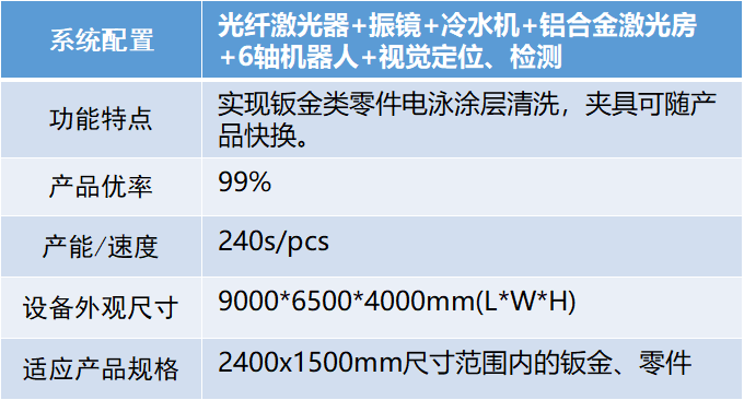 该设备应用于新能源电池箱盖电泳漆涂层的激光清洗,对应108个圆孔边缘直径10mm范围的漆层。清洗涂层厚度保证在0.035mm,使用振镜配套高精度机器人加激光测距仪控制清洗焦距。实现100%优率保证清洗的精度,且不损伤电泳涂层下的镀锌层。