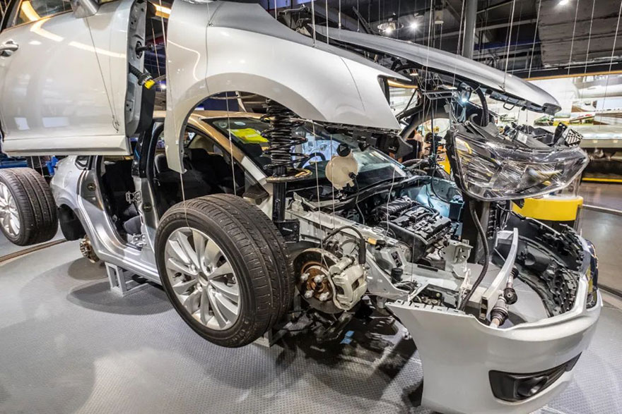 一辆汽车约由2万个零部件组装而成,其中铁制零件占绝大多数,虽然统称为铁,但是构成车体框架的车架和塑造车型的车身部分使用的是钢板、变速器等箱体部分使用的是将铁熔化并注入模具做成的铸件。因此,焊接工序在汽车生产加工过程中是一项不可或缺的工序,比如车架、车身、车厢、发动机、汽车齿轮、车顶、车门、汽车座椅滑动件、汽车安全气囊内胆、排汽管、汽车离合器等都离不开焊接技术。