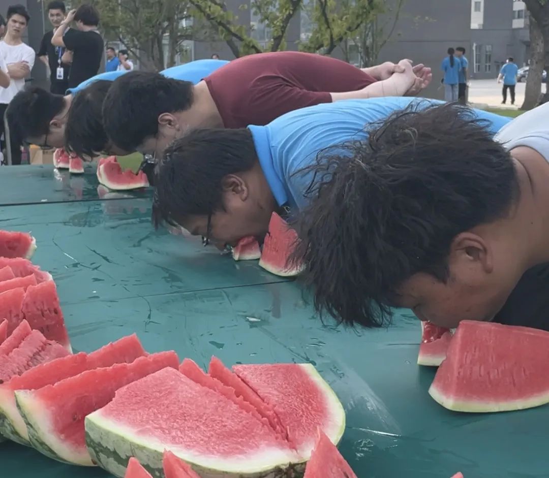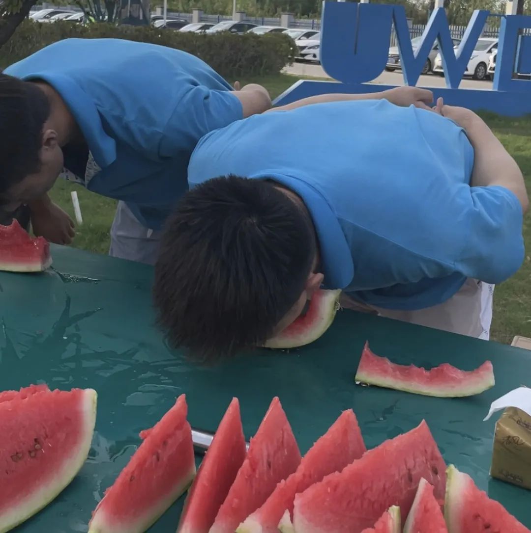 合作共赢:员工两人成团,分五组一轮进行比赛,甲负责喂西瓜,乙被蒙眼负责吃西瓜,过程中乙不可以手接触西瓜,触犯规则则淘汰,每轮最快吃完的前三个团队可获得奖品。