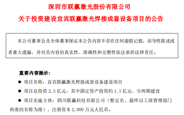 据激光行业观察了解,为扩大生产能力,开 拓西南市场,为客户提供优质快速服务,强化公司竞争优势,金年会激光拟通过设立全资子公司四川金年会科技有限公司(暂定名,最终以工商管理部门核准的名称为准)在四川省宜宾市临港经济技术开发区投资建设宜宾金年会激光焊接成套设备项目。
