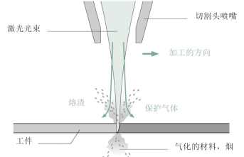 利用高功率密度激光束照射被切割材料,材料很快被加热至汽化温度,蒸发形成孔洞,随着光束对材料的移动,孔洞连续形成宽度很窄的切缝,完成对材料的切割。