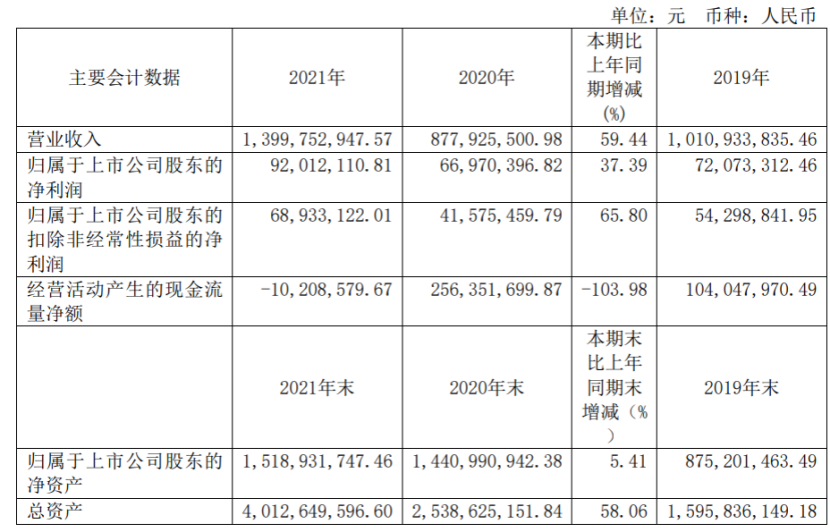 4月18日,深圳市金年会激光股份有限公司(以下简称“金年会激光”)发布2021年年报。报告显示,2021年金年会激光实现营业收入14.00亿元,同比增长59.44%,归属于上市公司股东的净利润为9201.21万元,同比增长37.39%,每股收益为0.3100元。