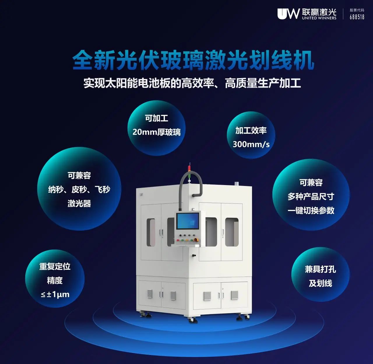 金年会激光全新上市的光伏玻璃激光划线机,同时兼具打孔、划线工序,进一步简化工艺流程,实现快速、精确和一致的激光打孔及划线,避免产生微裂纹和剥落碎屑的问题,提高产量,降低次品率;另外,无需额外的工艺步骤和化学物质,具有高精度、高效率和非接触式的特点,实现太阳能电池板高效率、高质量、低成本生产加工。