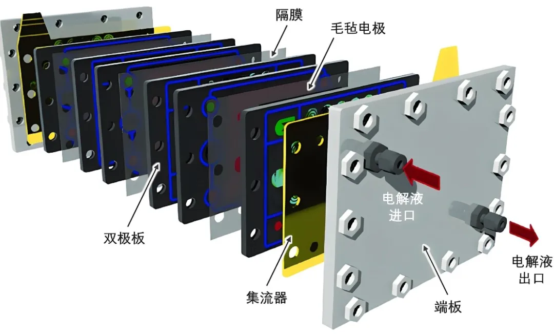 液流电池主要由电堆、电解液、储液体系、电池管理体系、充放电体系、储能监控体系等部分组成,液流电池电堆的结构与燃料电池电堆比较相似。